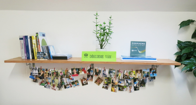 (Foto: Na poličce v kanceláři máme obrázky všech, komu pomáháme.)