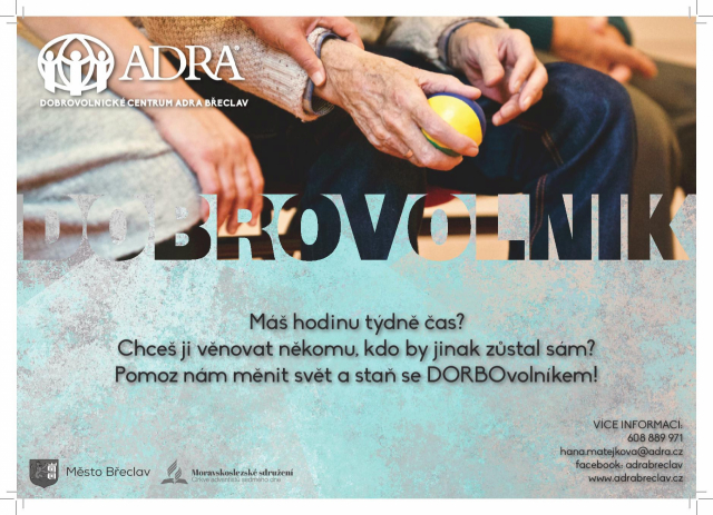 Hledáme dobrovolníky pro Domov seniorů v Břeclavi, kteří by rádi zpříjemnili dny jeho obyvatelům. Dobrovolník pravidelně navštěvuje svého seniora a buduje si s ním přátelský vztah. Povídají si, čtou, hrají hry nebo chodí na procházky.