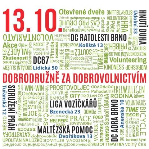 Sedm brněnských neziskových organizací se představí 13. října v rámci speciálního dne otevřených dveří s názvem Dobrodružně za dobrovolnictvím. Návštěvníci se budou moci seznámit se se zákulisím jednotlivých organizací a zúčastnit se do programu, který bude v jednotlivých organizacích připraven a to od 14.00 do 18.00 v sídlech jednotlivých organizací, včetně DC ADRA Brno. Od 19.00 se mohou návštěvníci těšit na setkání v Bajkazylu, kde bude přichystaná tombola, jarmark dobrovolnických příležitostí, proběhne storytelling, zahraje DJ a aktivní účastníci budou odměněni originální ručně vyráběnou taškou.