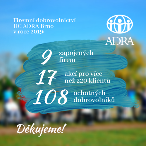 Kromě dlouhodobého dobrovolnictví nám v roce 2019 dělaly radost i jednorázové akce – naše oblíbené Dobrodny. Spolu s dobrovolníky z různých brněnských firem jsme pro seniory zorganizovali několik výletů do přírody a výprav do obchodních center, společnými silami zútulňovali zahrady nebo v domovech před Vánocemi tvořili krásnou adventní výzdobu.