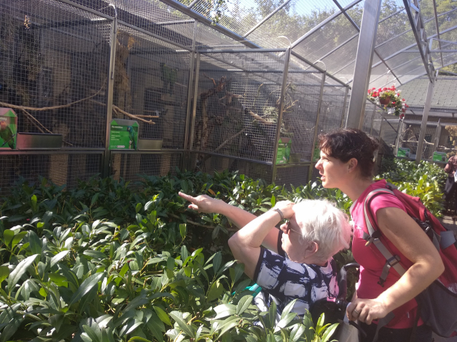 Každý dobrovolník byl doprovodem (i DOBROvodem) jednoho seniora na invalidním vozíčku. Společně jsme si prohlédli voliéry s asi 200 druhy papoušků a obdivovali krásu jejich barev, jak jsou velicí či naopak jak jsou maličcí, a rozhodně nepřeslechli sílu jejich společného „povídání“. K obědu nám Domov sbalil každému řízek, a pak jsme si dali „něco dobrého“ v místní kavárničce: kávičku, zmrzlinku nebo nějaké jiné potěšení. Společný čas strávily skupinky či dvojice povídáním a sdílením svých životních příběhů.