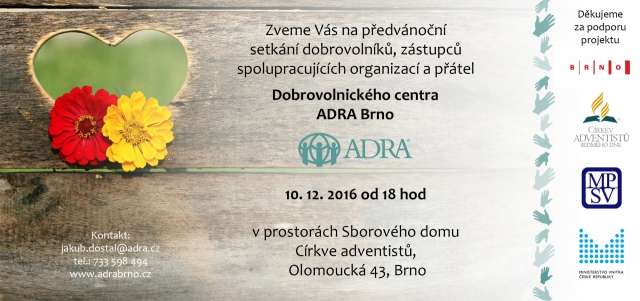 Srdečně zveme všechny naše dobrovolníky, zástupce spolupracujících organizací, ale vůbec všechny, které zajímá naše práce, na slavnostní večer k příležitosti roku dobrovolnického programu ADRA Brně. Rádi bychom také společně oslavili Mezinárodní den dobrovolníků, který se každoročně slaví 5. prosince.