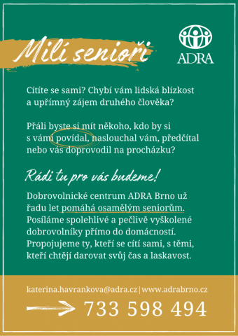 Rádi tu pro vás budeme. Dobrovolnické centrum ADRA Brno už řadu let pomáhá osamělým seniorům v sociálních zařízeních, nově posíláme spolehlivé a pečlivě vyškolené dobrovolníky přímo do domácností. Propojujeme ty, kteří se cítí sami, s těmi, kteří chtějí darovat svůj čas a laskavost.