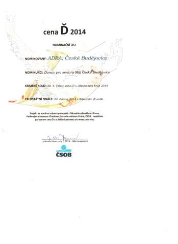 Domov pro seniory Máj v Českých Budějovicích nominoval dobrovolníky z Dobrovolnického centra ADRA na cenu Ď 2014. Samotná nominace je vyjádřením díků aktuálně 25 lidem, kteří zde ochotně a pravidelně navštěvují seniory. Je to ocenění těm, kteří pochopili, že žít život je třeba nejen v jeho délce, ale také v jeho hloubce.