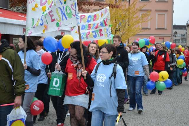 V 15:00 zazněly na náměstí Přemysla Otakara II. v Českých Budějovicích bubny. Kolem Samsonovy kašny se shromáždilo již přes 100 dobrovolníků. Všichni byli oblečeni do "svých barev" podle toho, k jakému dobrovolnickému centru patřili. Nad hlavami přítomných se pohupovaly pestré balonky.