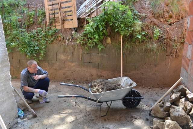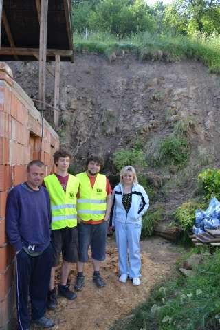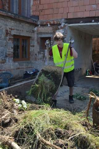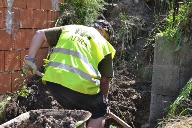 Úklid zeminy po sesutém svahu prováděli dobrovolníci pod hlavičkou ADRY na Táborsku. Svah se uvolnil vlivem dešťů při letošních povodních a sesutá zemina nalehla na obvodovou zeď domu.