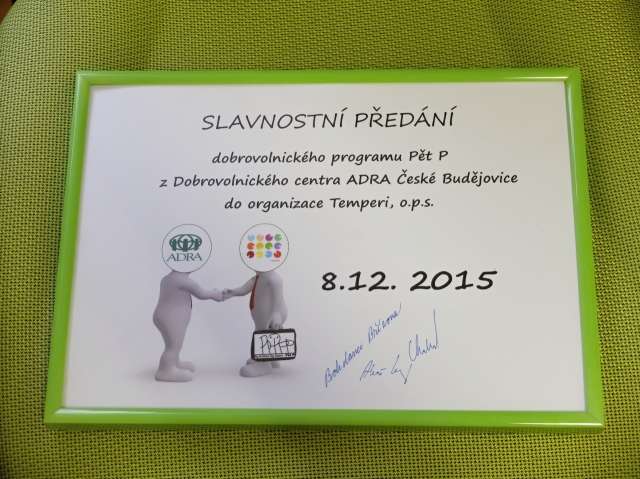 8.12.2015 byl mentoringový program Pět P slavnostně předán organizaci Temperi, která dlouhodobě pracuje s dětmi a s rodinami. Doprovází pěstounské rodiny a tématem dětských skutečných problémů se intenzívně zabývá. Proto také daleko více využije činnost dobrovolníků přímo mezi svými klienty a je schopná také dobrovolníky odborně připravovat a vést. Naše Dobrovolnické centrum se chce více specializovat na dobrovolnickou službu u seniorů a lidí s postižením v Českých Budějovicích a nejbližším okolí.