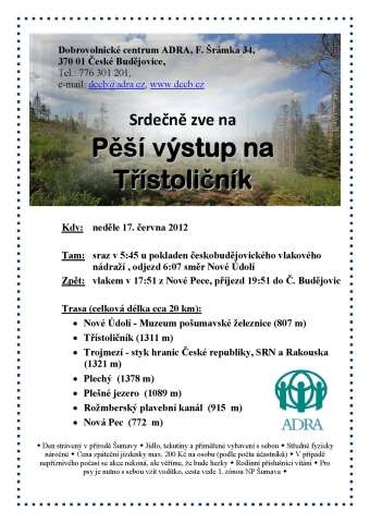 Přidejte se k nám - v neděli 17. června se společně vydáme na pěší výlet. Jsou zváni všichni, kteří jakýmkoliv způsobem podporují naše dobrovolnické centrum. Užijeme si okouzlující náladu šumavských hvozdů, protáhneme tělo, osvěžíme ducha a zajisté i vyprahlé hrdlo. Těšíme se na Vás, přiberte s sebou kamarády i rodinné příslušníky. Podrobnosti naleznete v pozvánce.