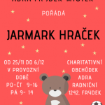 Přijďte od 25. listopadu do 6. prosince do Charitativního obchůdku ADRA nedaleko frýdeckého zámku na ulici Radniční. Provozní doba je pondělí až čtvrtek 9 - 16 hodin a v pátek 9 - 14 hodin. Jarmark hraček je již tradiční akcí, jejímž cílem je dát darovaným hračkám a plyšovým medvídkům "druhou šanci" a dále v rámci veřejné sbírky získat finance pro podporu a rozvoj dobrovolnictví.