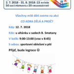 Pošlete své děti /vnoučata/neteře/synovce na zábavný dopolední program pro děti, který pořádá naše Dobrovolnické centrum v rámci Prázdnin ve městě, a to ve ČTVRTEK 12. července v Sadech Bedřicha Smetany v Místku. Sraz je u altánku v 8:45. Program bude trvat do 13:00. Více informací viz. plakátek.