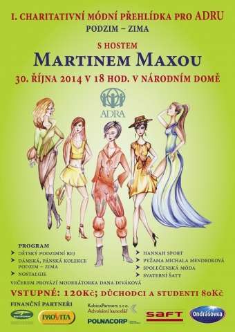 Kolekci podzim – zima uvede slovem Dana Diváková. Módní přehlídku podpoří host večera Martin Maxa. Lístky jsou k zakoupení ve všech charitativních obchůdcích ADRA od 25.9. do vyprodání. Běžná vstupenka přijde na 120 Kč, studentům a důchodcům vyjde na 80 Kč. Jakékoliv informace poskytne Ing. Irena Šiková M +420 734 646 061.