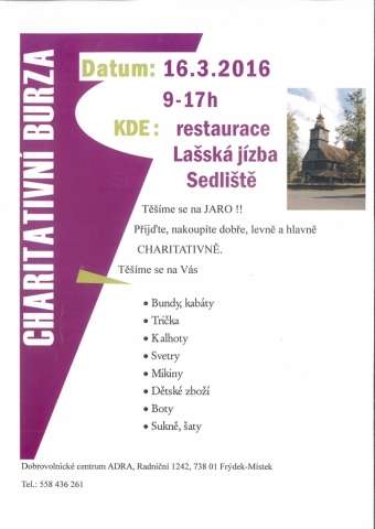 Těšíte se na jaro? Chcete udělat dobrý skutek a přitom si pořídit něco hezkého na sebe? Pokud byla Vaše odpověď na tyto tři otázky kladná, navštivte naší CHARITATIVNÍ BURZU. Nakoupíte levně a přispějete na chod našeho Dobrovolnického centra ADRA Frýdek-Místek. Akce se koná dne 16. 3. 2016 od 9.00 - 17.00 hodin v restauraci Lašská jizba v Sedlištích !! Více na přiloženém letáčku..