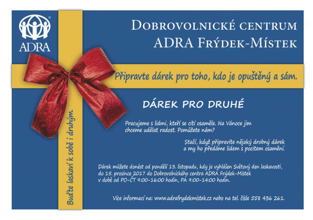 Jestli budete mít cestu poblíž Dobrovolnického centra ADRA Frýdek-Místek, Radniční 1242, stavte se tam s malým dárkem, kterým uděláte radost někomu osamělému. Dárky můžete nosit nejpozději do 15. prosince v době PO-ČT 9:00-16:00 hodin, PÁ 9:00-14:00. Děkujeme, že myslíte na druhé.