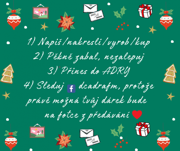 Opatřete dáreček i malým vzkazem či dopisem, buďme na sebe laskaví, obzvláště letošní rok! Dáreček můžete přinést v době PO-ČT 9:00-16:00 hodin, PÁ 9:00-14:00 do Dobrovolnického centra ADRA Frýdek-Místek na ul. Radniční 1242 ve Frýdku. A nezapomeňte, že zapojit můžete i děti!