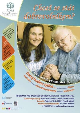 Dobrovolnické centrum ADRA ve Frýdku-Místku nabízí stále dobrovolnické příležitosti ve spolupracujících partnerských organizacích měst Frýdek-Místek a Frýdlantu nad Ostravicí. V rámci jednoduchého hesla „Daruj hodinu týdně…“ vybízí veřejnost k dobrovolnické činnosti.