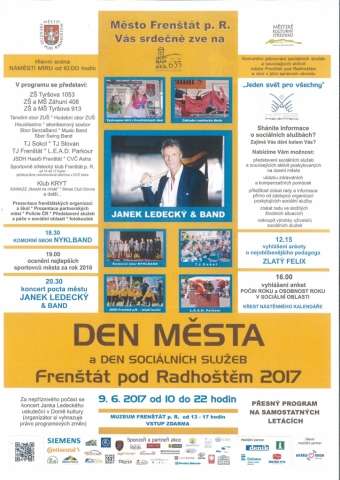 V pátek 9.6. se uskutečnila již tradiční akce Den města a den sociálních služeb Frenštát pod Radhoštěm. Po celou dobu akce byl program opravdu nabitý – nechyběla vystoupení dětí z frenštátských škol, ze základní umělecké školy, ale také vystupovaly děti z TJ Sokol nebo se divákům představil komorní sbor NYKLBAND a mladí hasiči z Frenštátu pod Radhoštěm. Byla vyhlášena osobnost roku v sociálních službách.