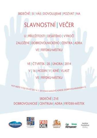 U příležitosti 10. výročí Dobrovolnického centra proběhne 20. února setkání zaměstnanců, dárců, význačných hostů, spolupracujících organizací a dobrovolníků od 16.00 hodin v Nové scéně Vlast, v rámci kterého si frýdecko-místecké pracoviště připomene úspěchy uplynulých deseti let a ocení nejvytrvalejší dobrovolníky.V souvislosti s touto oslavnou akcí bude provozní doba všech Charitativních obchůdků ADRA v tento den upravena, a to od 9:00 do 12:00.