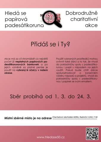 Rádi bychom Vás informovali o dobrodružně charitativní akci s názvem „Hledá se papírová padesátikoruna“, která se koná od 1.3. do 24.3. Tuto akci pořádají členové Studentského dobrovolnického klubu ADRA a spolku Házíme lano. Akce má za cíl shromáždit co největší počet již neplatných papírových padesátikorunových bankovek a po jejich výměně za platné peníze je použít na dobročinný účel.