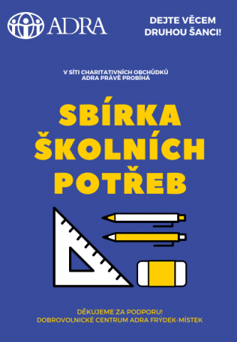 Chceme tímto oslovit občany (organizace, firmy), kteří budou chtít podpořit děti ze sociálně slabších rodin, aby případné školní pomůcky (ať již použité či nové) donesly do jednoho z našich ADRA obchůdků. Tato sbírka školních potřeb se stane součástí našeho nabízeného sortimentu v obchůdcích, tak jako veškeré jiné darované zboží. Předem děkujeme za Vaši podporu v duchu „Pomáhejme s rozumem, ale i s citem“!