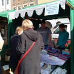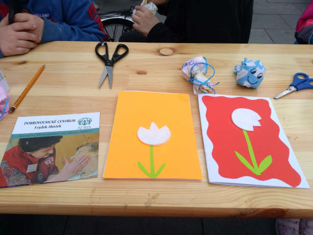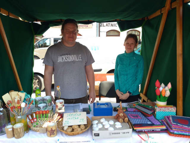 Na fotkách můžete vidět, co tvořily děti v naší provizorní dílničce. Také je zde důkaz, že štěstíčka se velice dobře prodávala. Dokonce Gabka a Pavel v sobotu některá štěstíčka balili přímo na stánku, když všechna štěstíčka byla vyprodána. Z jejich rukou vyšla i velikonoční štěstíčka. Na jedné z fotek také můžete vidět dva naše dobrovolníky ze Studentského dobrovolnického klubu. Bohužel jsou zezadu, když jsem jim řekla, ať se otočí, a že je vyfotím – v cukuletu byli pryč. Co se týká našeho stánku, tak v sobotu byla zde jedna novinka. Pavel přivezl pěkný stojan na prkýnka a obracečky.., které dozdobují lidé z chráněné dílny, kterou pod sebou má organizace Házíme lano, z.s.