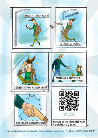 Pomocí neobvyklého způsobu - komiksů se od září letošního roku snažíme oslovit veřejnost a informovat ji o činnosti našeho dobrovolnického centra. Lidé mají možnost se s komiksy setkat v městské hromadné dopravě, u pokladniček ADRA, nově i v některých spolupracujících zařízeních a obchodech.