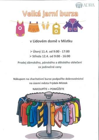 Už po několikáté pořádáme jarní burzu, která se uskuteční 11.- 12. dubna od 9:00 v Lidovém domě v Místku. Nabízíme Vám široký sortiment oblečení. Přijďte a nakupte originální kousky do vašeho šatníku. Těšíme se na Vás.