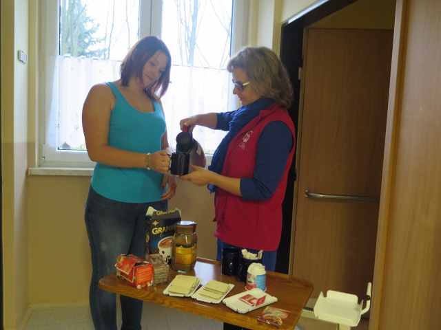 Ochotný personál nás usadil do příjemného prostředí tamní útulné návštěvní místnosti, kde jsme měly k dispozici jak stůl se židličkami, tak rychlovarnou konvici. U dobrého čaje či horké čokolády velice brzy zavládla hřejivá atmosféra. Za krátkou dobu jsme již vůbec nevnímaly, že se nenacházíme v opravdové kavárničce.