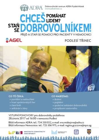 Vstupní pohovory se zájemci o dobrovolnictví v této nemocnici proběhnou v úterý 28. února 2017 od 16.00-18.00h přímo v nemocnici Podlesí.