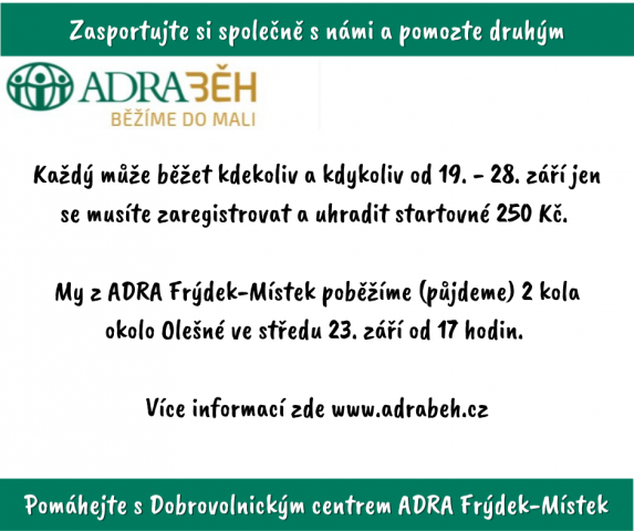 My z ADRA Frýdek-Místek poběžíme (půjdeme) 2 kola okolo Olešné ve středu 23. září od 17 hodin. Přidejte se k nám! Více informací zde www.adrabeh.cz