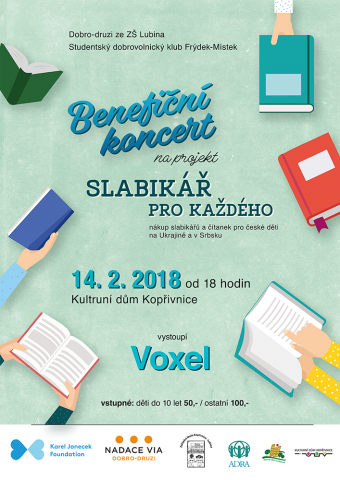 Dobro-druzi ze základní školy Lubina ve spolupráci se Studentským dobrovolnickým klubem Frýdek-Místek (SDK FM) uspořádají BENEFIČNÍ KONCERT na podporu projektu s názvem SLABIKÁŘ PRO KAŽDÉHO. Z výtěžku koncertu budou zakoupeny slabikáře a čítanky pro české děti žijící na Ukrajině a v Srbsku. Koncert se koná již 14. 2. od 18:00 v Kulturním domě Kopřivnice. Největším tahákem tohoto benefičního koncertu je vystoupení zpěváka a písničkáře Voxela alias Václava Lebedy.