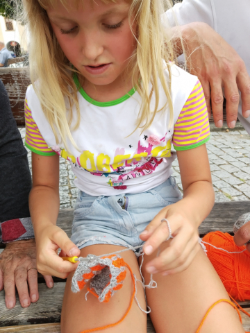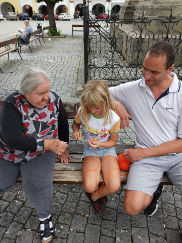 Paní Věrka z Domova u Kašny v Kroměříži se díky svému dobrovolníkovi Radimovi stala učitelkou háčkování. Jeho dcera Vendulka je velmi tvořivá a manuálně zručná a umět háčkovat byla její touha. A tak se to sešlo. Přes vysoký věk paní Věrky (90 let) vzniklo krásné souznění s mládím, praktické využití času a pěkné přátelství."