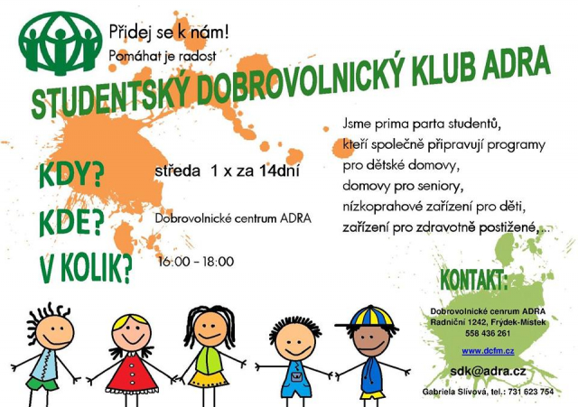 Studentský dobrovolnický klub ADRA (dále jen SDK ADRA) existuje v různých formách od roku 2003. Hlavní myšlenkou SDK ADRA je společná dobrovolnická služba skupiny mladých lidí, studentů, kteří se pravidelně scházejí, plánují a poté realizují výtvarné, sportovní, zábavné akce či výlety pro seniory, osoby s postižením či děti z dětských domovů.