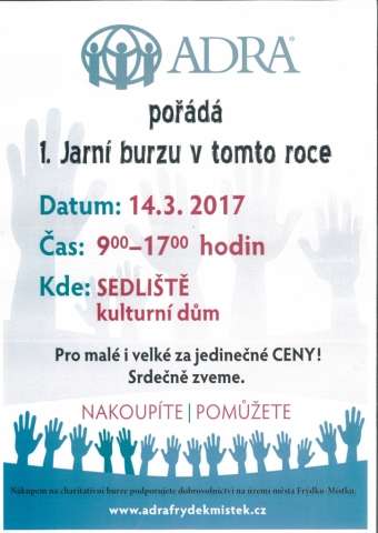 Srdečně Vás zveme na 1. Jarní burzu, která se uskuteční v úterý 14.3. od 9:00-17:00 v Sedlištích v kulturním domě. Na výběr bude z velkého množství zboží, pro malé i velké za jedinečné ceny! Nákupem na této burze podpoříte dobrovolnické programy ve Frýdku-Místku.
