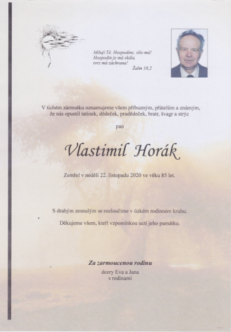 S lítostí v srdci oznamujeme, že nás dne 22. listopadu 2020 ve věku 85 let opustil náš dlouholetý dobrovolník Vlastimil Horák.