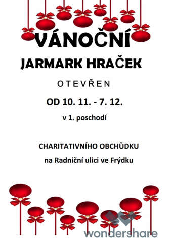 Tímto bychom Vás rádi pozvali na 1. Vánoční jarmark hraček, který se uskuteční od 10.11. do 7.12. v prvním patře charitativního obchůdku na Radniční ulici 1242. Zakoupit můžete kostky, zvířátka, plyšové hračky, knihy, bloky atd. Těšíme se na Vás. :-)