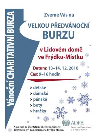 Tímto bychom Vás rádi pozvali na velkou předvánoční BURZU! Všichni, kteří rádi nakupujete, využijte jedinečné příležitosti a přijďte 13.-14.12. do Lidového domu ve Frýdku-Místku a nakupte skvělé věci! Nakupovat můžete od 9-16 hodin. Těšíme se na Vás.