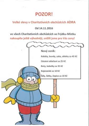 Pozor, pozor..snížili jsme pro Vás ceny!!! Ve všech našich charitativních obchůdcích ve Frýdku-Místku můžete od pondělí 14.11. využít velkých slev při nákupu. Tedy...nakoupíte ještě výhodněji. Například kabáty, bundy, saka, obleky za 45 Kč, kojenecké oblečky za 10 Kč a mnoho dalších slev.