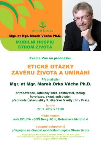 Přednáška se uskuteční 27. 1. 2017 v aule EDUCA – SOŠ Nový Jičín. Výtěžek ze vstupného jde na podporu činnosti Mobilního hospice Strom života.