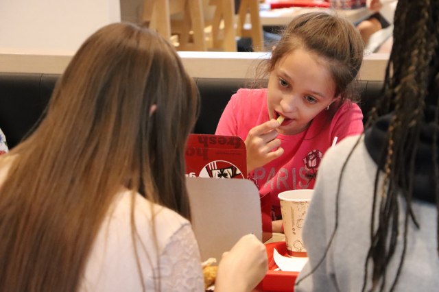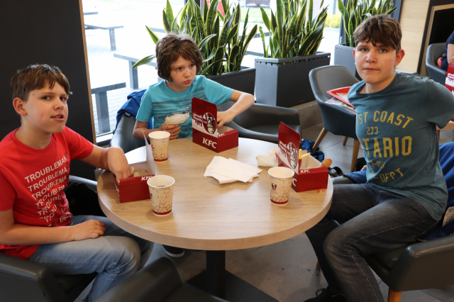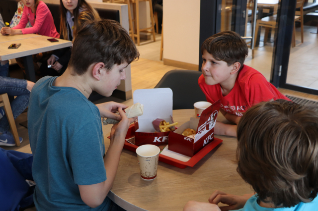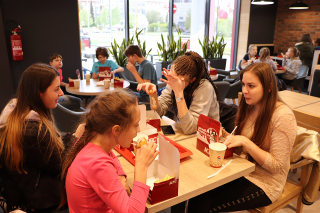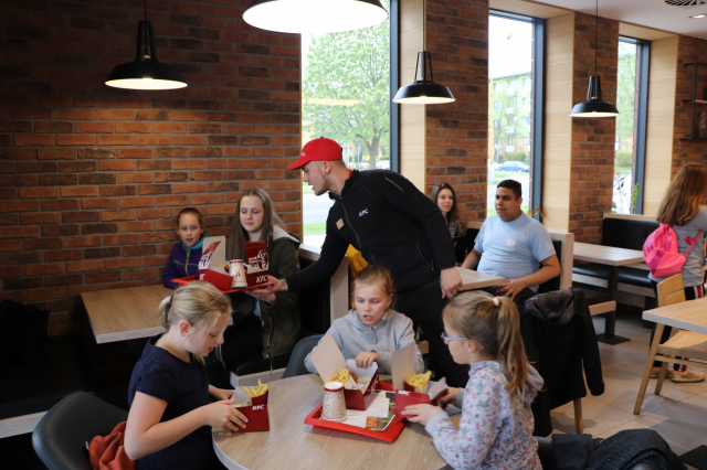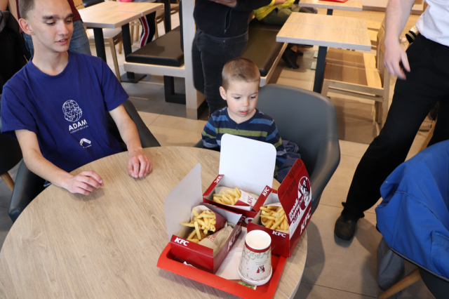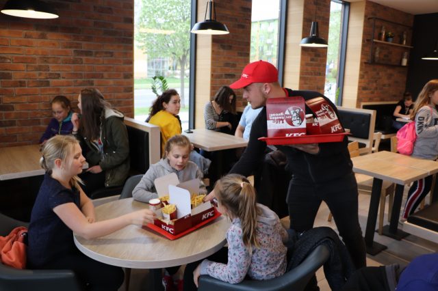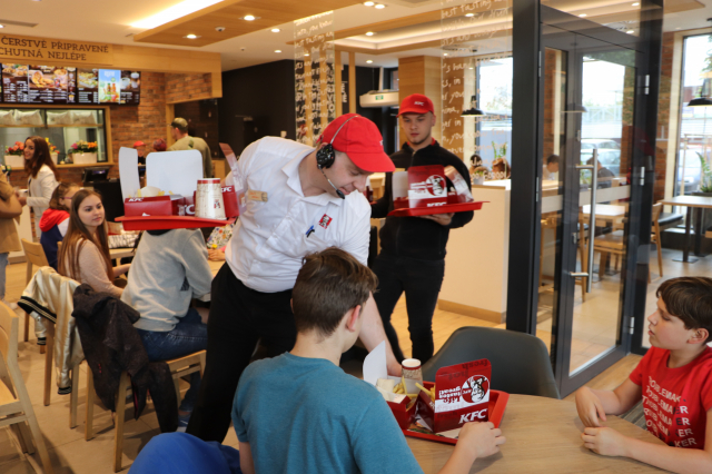 No, přáli bychom vám vidět naši dvacetičlennou výpravu, když dorazila do KFC Havířov, kde nás přivítal pan manažer Machat. „Vítám Vás v KFC, gratuluji k vašim výkonům a teď vám začneme nosit váš poklad,“ řekl manager havířovského KFC. A v tu chvíli se z kuchyně vyhrnuli číšníci s tácy plných šťavnatých kuřat, tortil, hranolek a nápojů. ADRA Havířov mooooc děkuje KFC Havířov za 20 bezplatných meníček pro naše soutěžící.