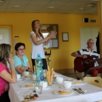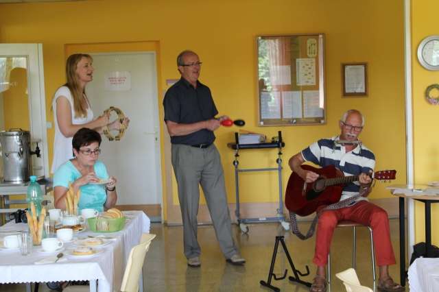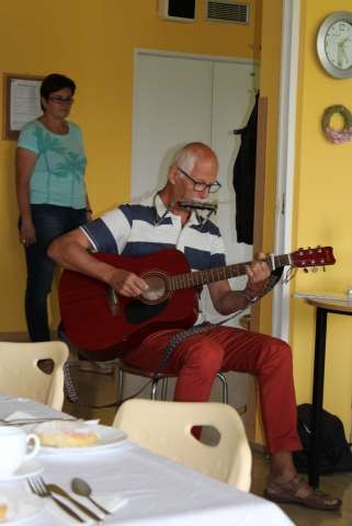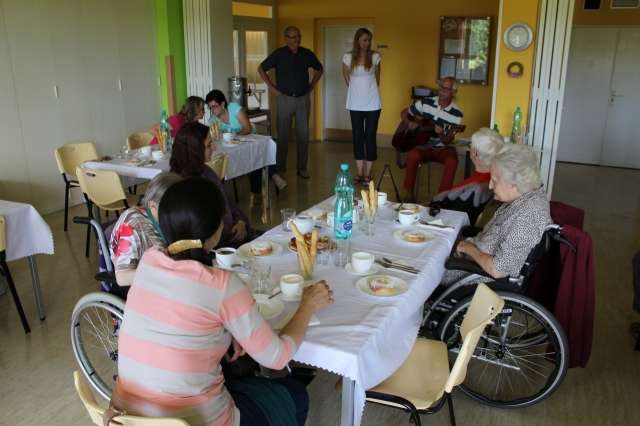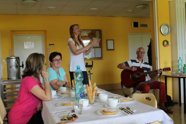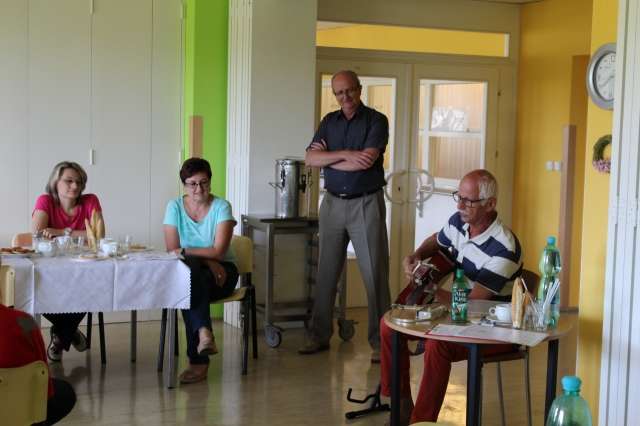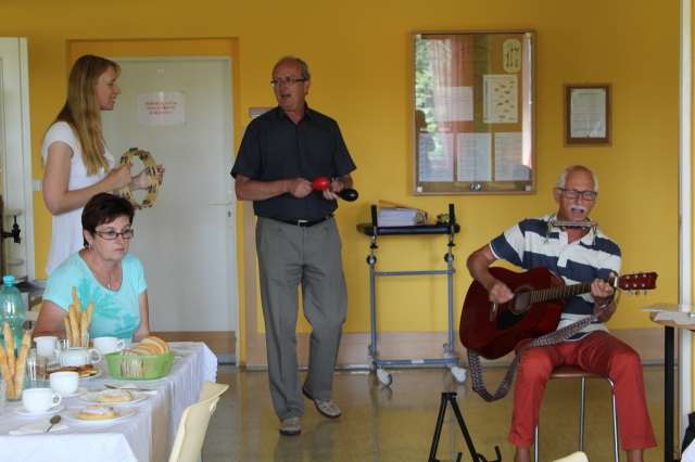 Hudební vystoupení pana Brunka bylo báječné, hrál na kytaru i harmoniku s takovou energií, že to přimělo nejednoho účastníka ke zpěvu. O skvělou zábavu se postarala aktivizační pracovnice paní Zajonc, která nás nepřestávala překvapovat svým obrovským nadšením a strhla tak ke zpěvu úplně všechny přítomné. Mimo jiné si připravila kvíz – dle obrázků jsme hádali názvy písní, které jsme pak zpívali.