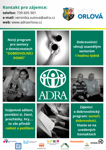 Dobrovolnické centrum ADRA v Orlové otevírá začátkem léta nový dobrovolnický program pro osamělé seniory žijící v domácnostech. Do jedinečného projektu „Dobrovolníci domů“ hledáme vhodné zájemce – seniory i dobrovolníky.