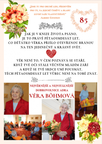 Kdo by nechtěl žít dlouho, spokojeně a ve zdraví? Naše nejstarší a stále usměvavá dobrovolnice paní Věrka Böhmová je pro nás všechny velkou inspirací. V úterý 22. 10. 2019 oslavila svých krásných a stále čilých 85 let. Adra u toho samozřejmě nesměla chybět. S obrovským nadšením ji blahopřáli nejen zaměstnanci Domova seniorů POHODA v Orlové, ale především její klienti – přátelé, které pravidelně navštěvuje.
