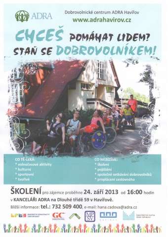 V úterý 24. září 2013 v 16.00 se v prostorách o. p. s. ADRA na Dlouhé třídě 59 v Havířově uskuteční školení pro zájemce o dobrovolnictví.