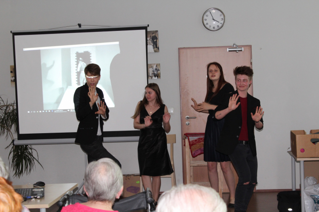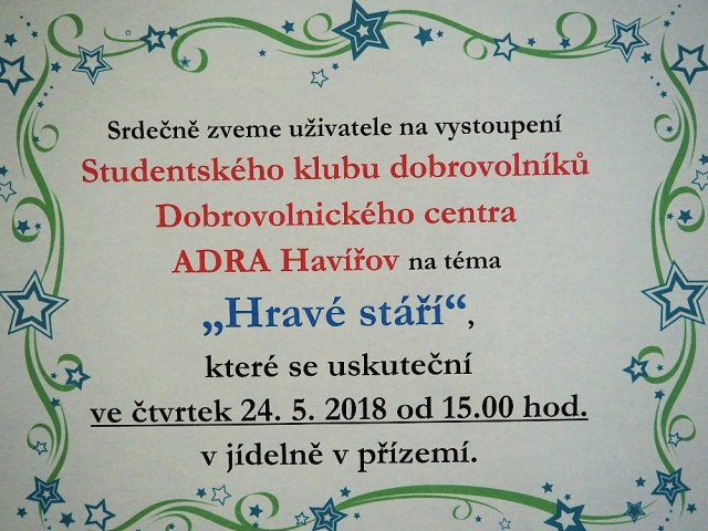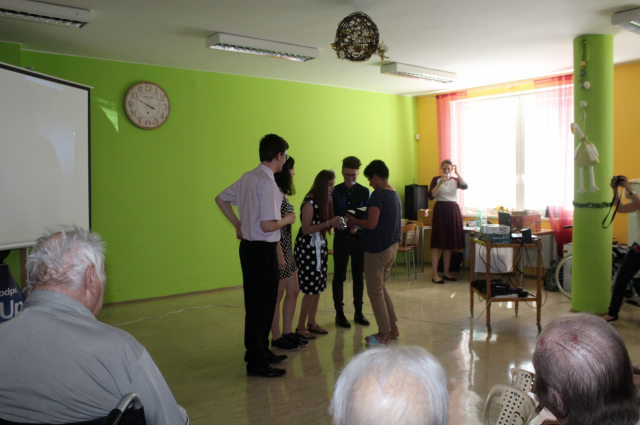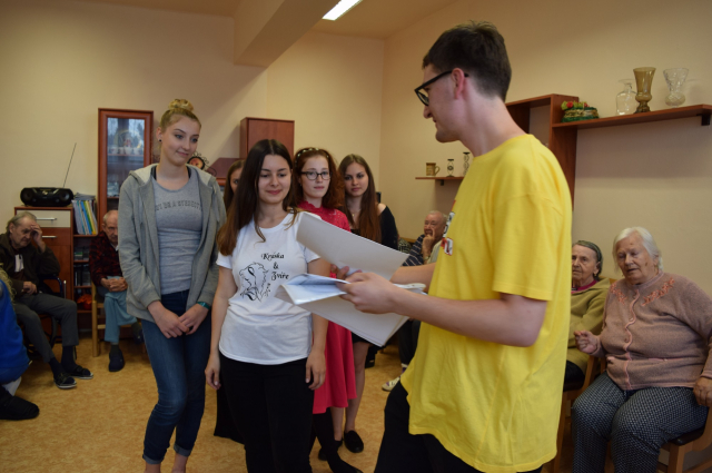 V květnu, v náročném mezidobí maturit a zkoušek, se nám podařilo absolvovat představení v domově pro seniory na ulici Sokolovská v Českém Těšíně, kde jsme zároveň úplně naposledy předvedli náš klasický program se scénkami, hádáním fotek, pouštěním písniček a tancem. Přišly nás podpořit Gabka Slívová ze studentského klubu ve Frýdku-Místku a Katka Polínková z ostravského studentského projektu MOST. Děkujeme, bylo to moc milé. Jo a koukněte se na milou pozvánku, která byla na nástěnce. :-)