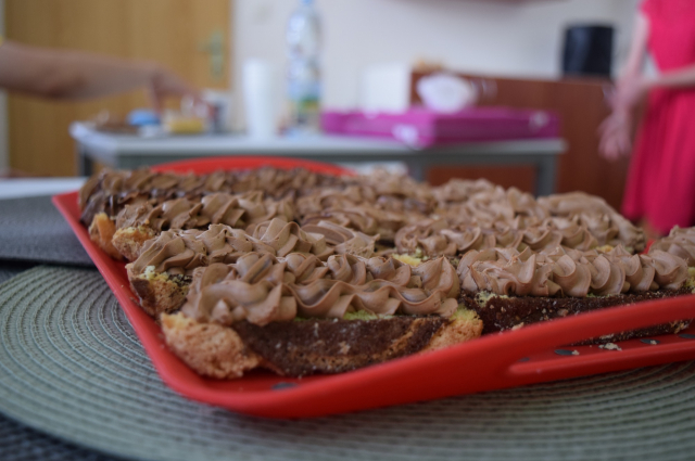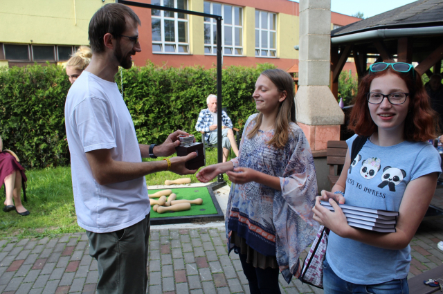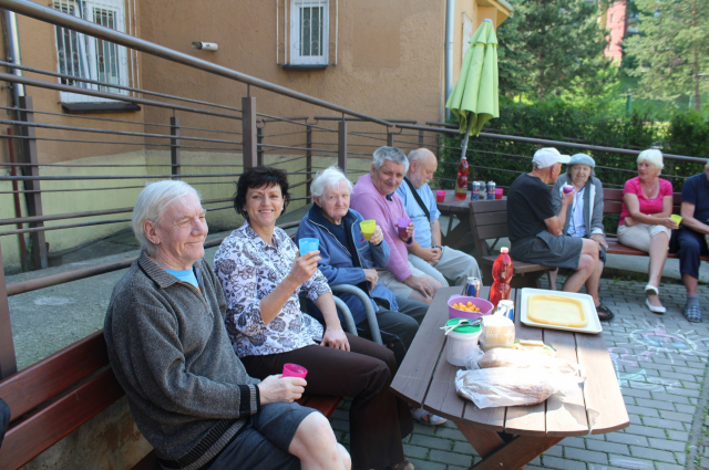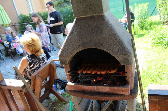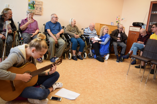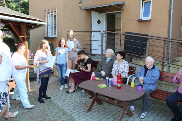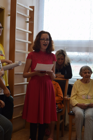 A Český Těšín do třetice. V domově pro seniory Slezské humanity jsme měli připravený zcela jiný program. Z důvodu nevelké společenské místnosti jsme se s pracovníky domluvili, že se zúčastníme opékání párků se seniory. K tomu jsme si se seniory zazpívali několik písniček i s kytarou, na níž hrály Lucka a Simča, a po svačince následovala část plná kvízů, hříček a trénování paměti. Doplňování přísloví, rčení a názvů filmů, hledání slov opačného významu, vymýšlení rýmů, vyjmenovávání co největšího počtu měst, zvířat, nábytku, písniček a mezitím jsme si se seniory povídali a vzpomínali, jak se dříve žilo - tohle všechno jsme se seniory zvládli. Rozdělili jsme se do menších skupinek, takže kontakt se seniory byl mnohem bližší, než je tomu u klasických představení. Na zahradě domova velmi rychle utíkal čas, zdrželi jsme se zde až do podvečerních hodin, protože to tu bylo opravdu příjemné.