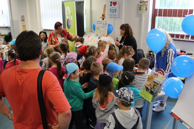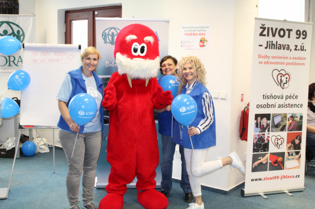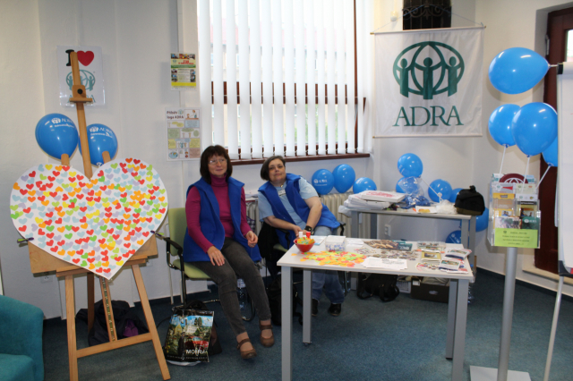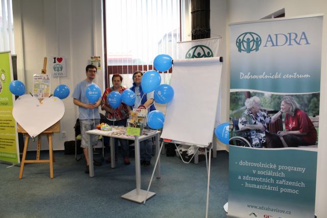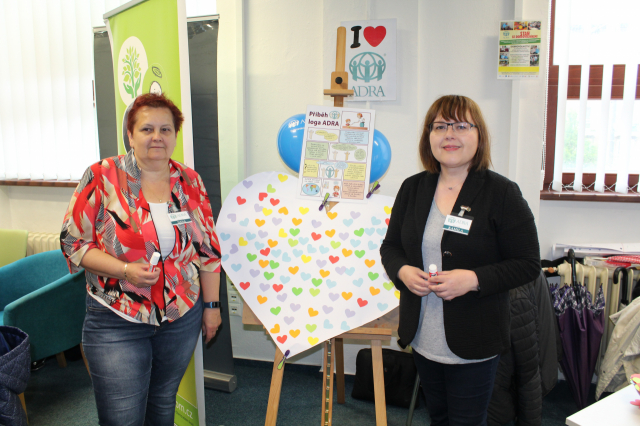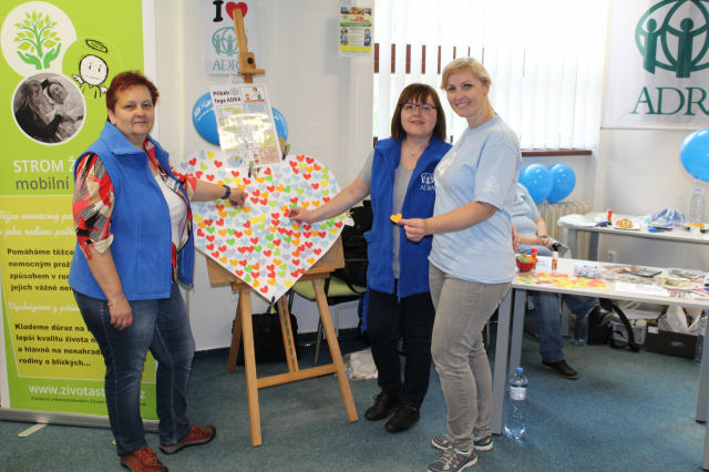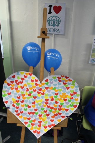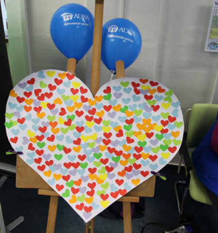 Tyto báječné a bezprostřední děti pak společně pomohly vytvořit barevné srdce ADRA, na které mohli všichni kolemjdoucí účastníci lepit malá různobarevná srdíčka. Dílo je velmi povedené a bude nám dělat radost v naší kanceláři a vlastně všem, kteří nás přijdou navštívit... tak přijďte také! :-)