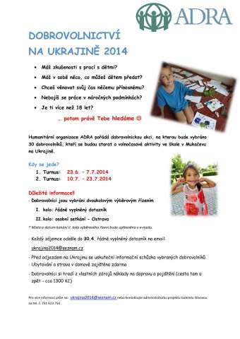 V letošním roce organizuje česká ADRA již 8. ročník letního tábora pro potřebné děti v ukrajinském Mukačevu ve střeženém areálu Základní školy 1.- 3. stupně č. 15, pod vedením pana ředitele Jurije Holishe.