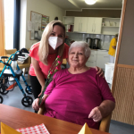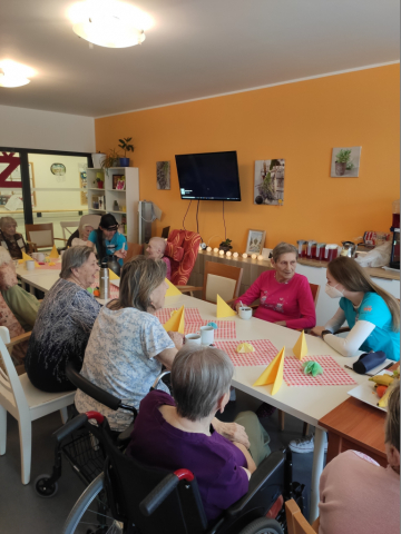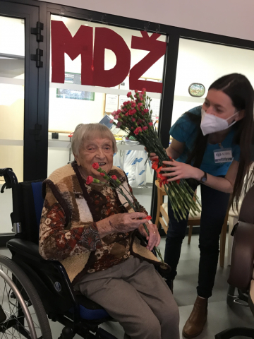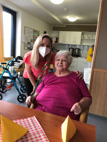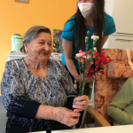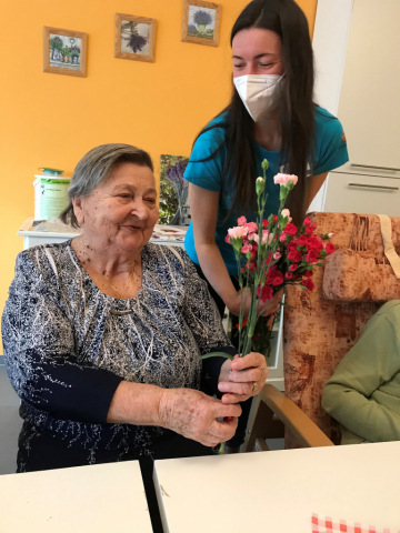 Nálada byla skvělá, všichni se dobře bavili, a tak už jen chyběla kytička pro naše klientky v tento slavnostní den. Tu předávali naši dobrovolníci společně s aktivizačními pracovnicemi a všem udělala velikou radost."