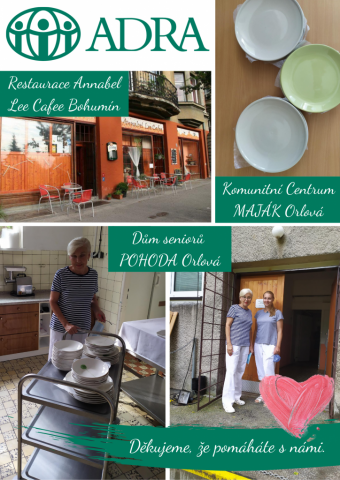 Pomoc od člověka ke člověku – logo ADRA, které naprosto funguje v naší praxi. Děkujeme restauraci a kavárně Annabel Lee Cafee z Bohumína, že se na nás obrátila s prosbou zprostředkování materiální podpory. I když se zaměřujeme především na dobrovolnictví u osamělých a potřebných lidí, pomoc formou věcných darů také vítáme.
