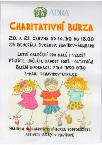 Ve čtvrtek a v pátek 20. a 21. června od 14.30 do 18.00 hodin pořádáme ve foyé ZŠ Generála Svobody v Havířově-Šumbarku prodejní charitativní burzu, jejíž výtěžek je určen na pomoc lidem zasaženým povodní.